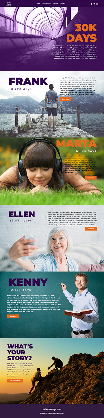 Suggested Content: A great domain for a site featuring ordinary individuals who are doing extraordinary things with the remaining days of their lives. 30,000 days is the average number of days in a typical human lifespan, and some people are making the most of their time. Feature interviews, must see destinations, promote important causes and events, offer classes for better living and more. Great for a non-profit that wants to create awareness to important issues.